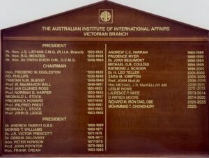 In that regard, on 22 June 1925 at a dinner at the Mitre Tavern, Chatham House members in Victoria met to discuss founding an overseas branch in Melbourne. Its first Chairman was the Rt Hon J.G. Latham, from 1925-1933, followed by former Prime Minister Sir Robert Menzies from 1933 to 1948 and the Rt Hon Sir Owen Dixon from 1948 to 1964. In 1933 the various state branches formed a federal organisation, the Australian Institute of International Affairs (“AIIA”), Australia’s longest-existing private research institute on politics and international relations. Its mission is to help Australians know, understand, and engage more in international affairs. It does this through an extremely active nationwide and international agenda, grounded in principles of political neutrality and open debate