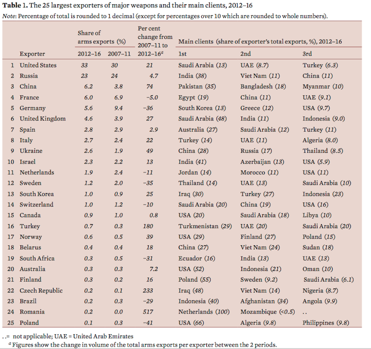 Between 2012 and 2016, according to a report released by the Stockholm International Peace Research Institute (SIPRI), countries near the bottom of the list of top 10 exporters (Spain, Italy, Ukraine and Israel) each had eight times more defence exports by value than Australia.