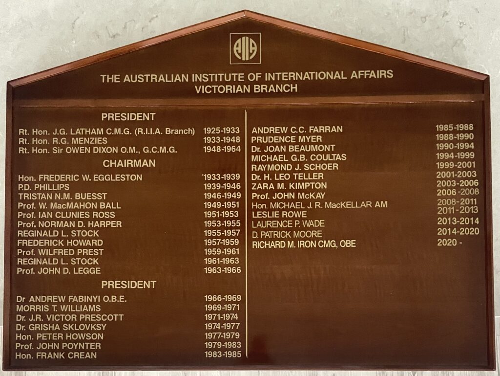 In that regard, on 22 June 1925 at a dinner at the Mitre Tavern, Chatham House members in Victoria met to discuss founding an overseas branch in Melbourne. Its first Chairman was the Rt Hon J.G. Latham, from 1925-1933, followed by former Prime Minister Sir Robert Menzies from 1933 to 1948 and the Rt Hon Sir Owen Dixon from 1948 to 1964. In 1933 the various state branches formed a federal organisation, the Australian Institute of International Affairs (“AIIA”), Australia’s longest-existing private research institute on politics and international relations. Its mission is to help Australians know, understand, and engage more in international affairs. It does this through an extremely active nationwide and international agenda, grounded in principles of political neutrality and open debate